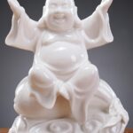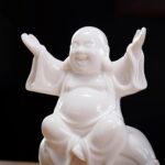 - The small ceramic white laughing Buddha statue sitting on a money bag is a beautiful and meaningful addition to any home or office, bringing joy, good fortune, and abundance to all who see it.